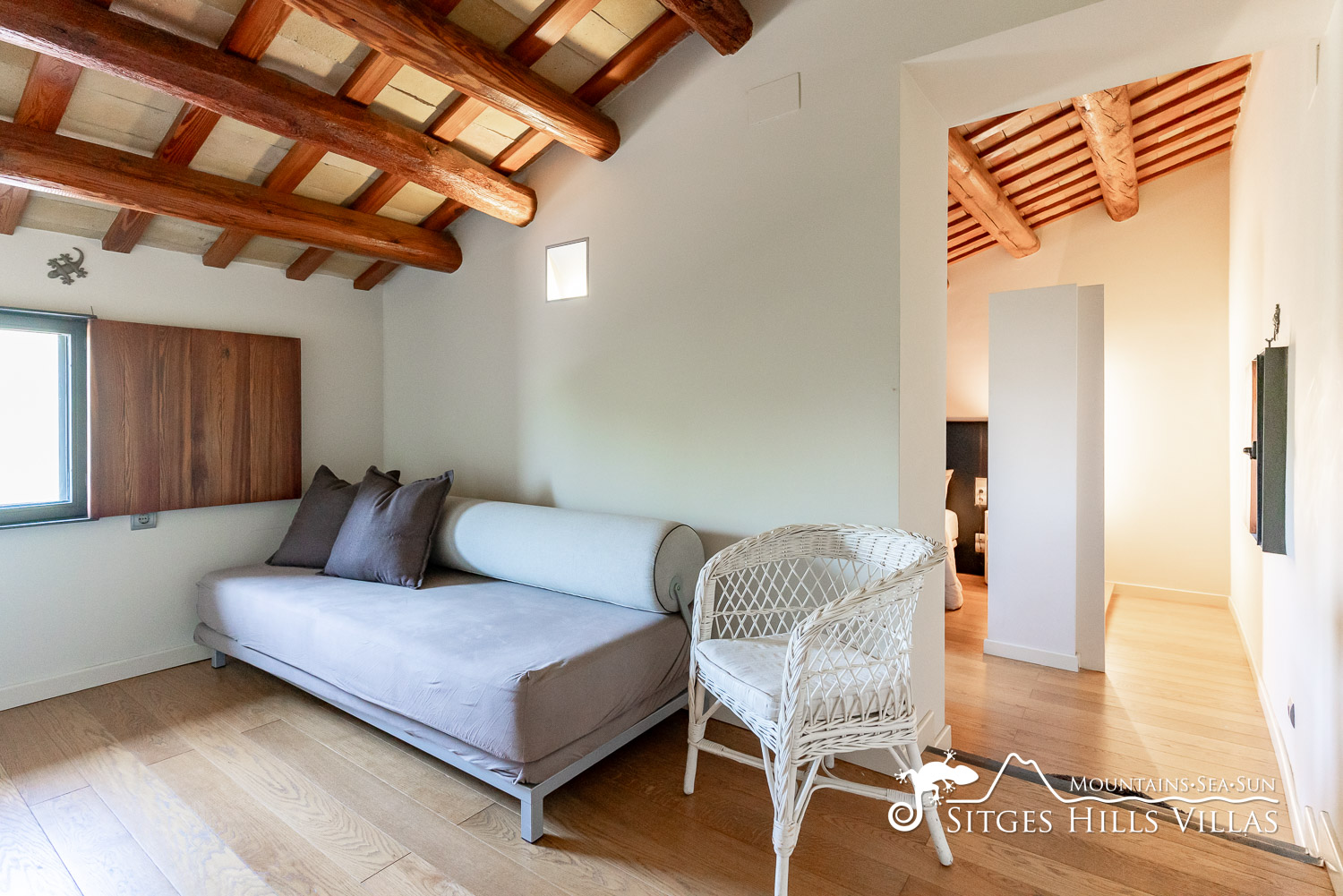 La sala de estar, conectada al despacho, cuenta con un gran sofá, televisión, chimenea y zona de lectura. El vestíbulo tiene lavabo y acceso a una oficina con escalera de acero industrial.